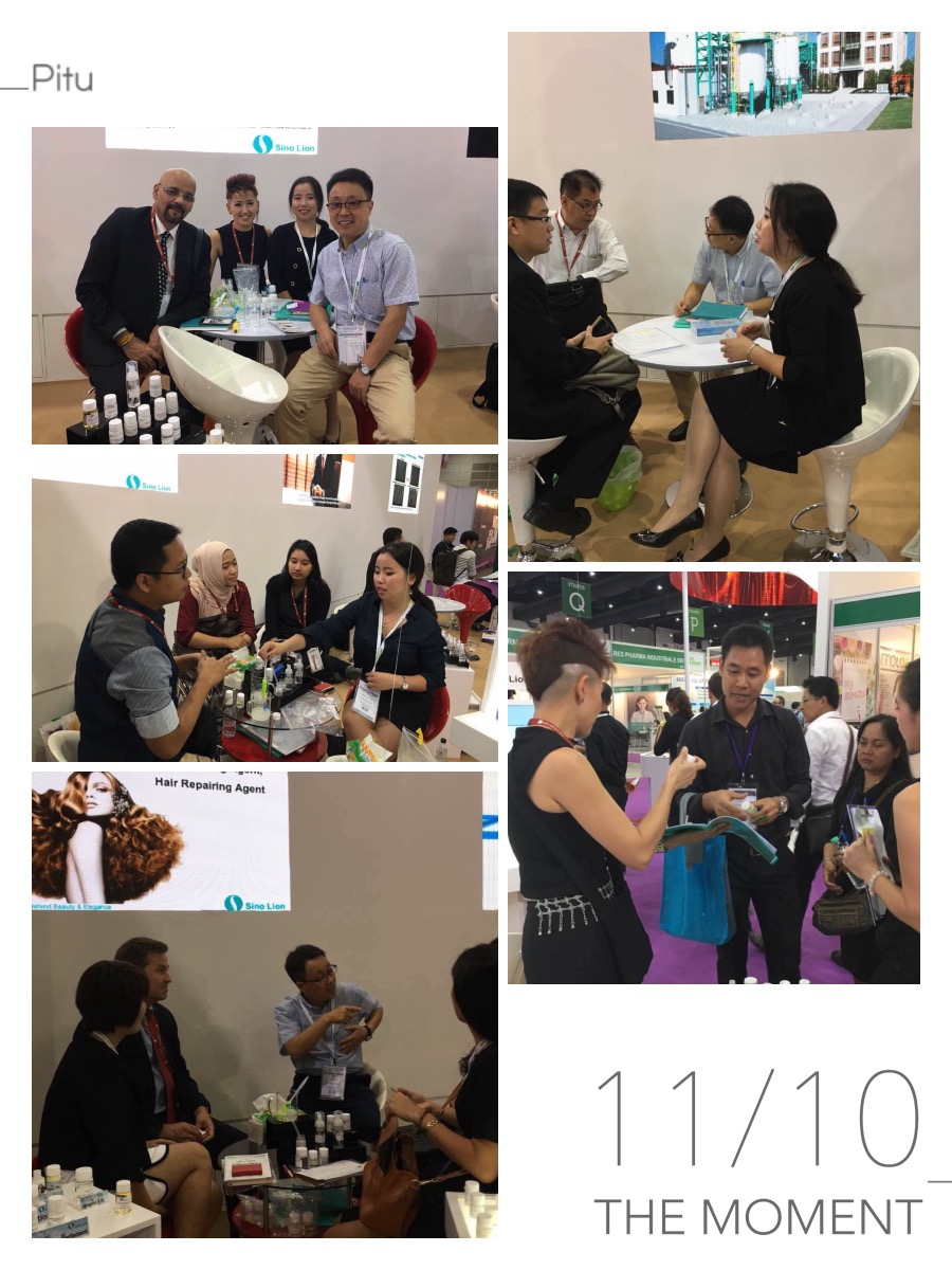 展會期間,前來我們展臺咨詢的客流密集,主要來自:泰國、印度尼西亞、韓國、菲律賓、越南、新加坡、巴基斯坦、孟加拉國、印度、日本、澳大利亞、新西蘭、英國、中國等至少14個國家,其中不乏有慕名從其他地區(qū)特意趕來的客戶,還有其他地區(qū)代理商介紹前來的客戶。他們的關(guān)注點也是主要集中在SINO LION的Eversoft氨基酸表面活性劑系列、Eversmooth液晶護發(fā)調(diào)理劑系列、KOKOTM/SenseHot 涼/熱感劑系列這三大類產(chǎn)品,我們也對這三類產(chǎn)品的性能特點、配方應(yīng)用、相關(guān)認證以及自增稠技術(shù)等向他們做了比較詳細的介紹。