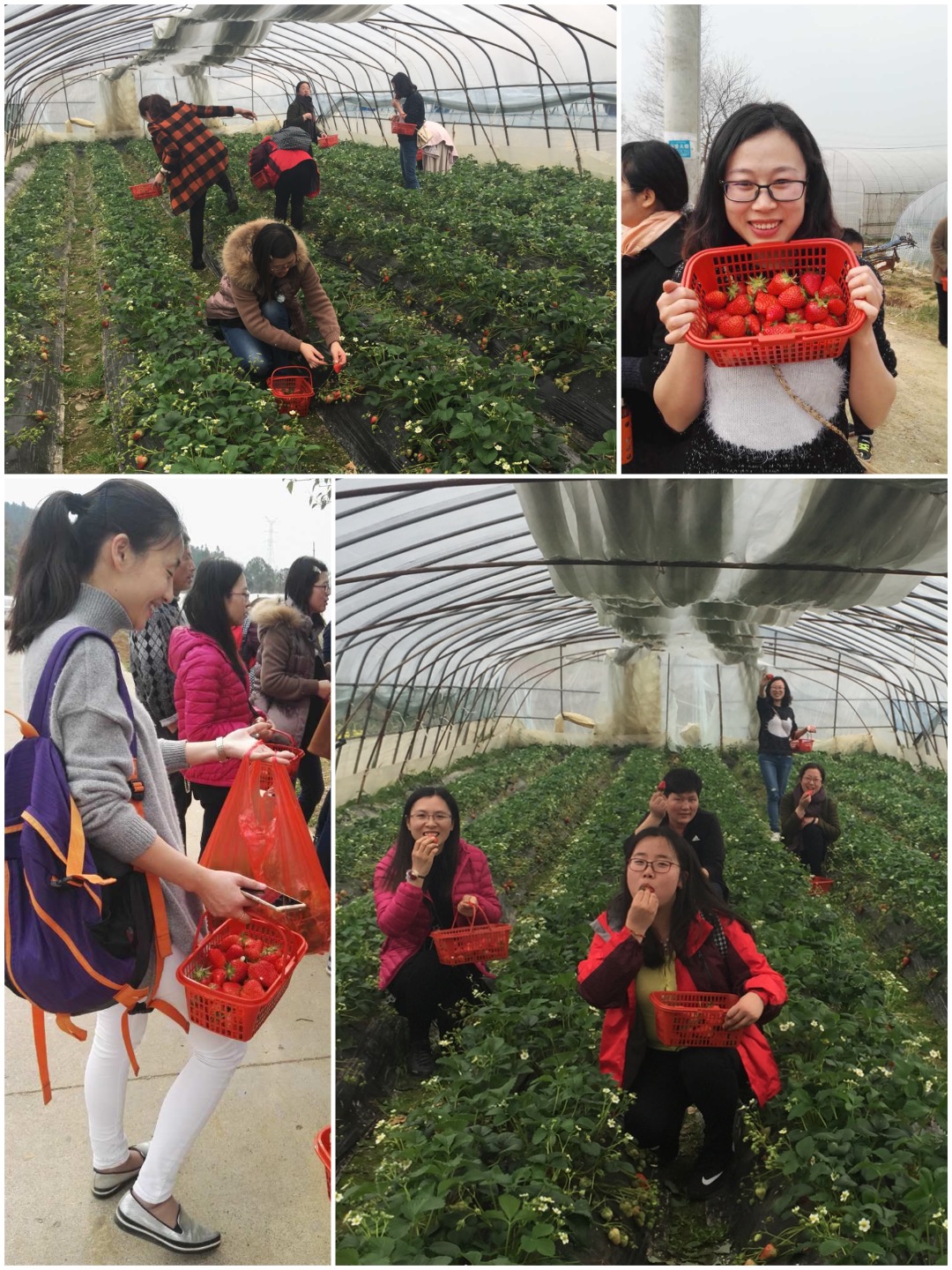 我們第二站是體味農(nóng)家樂,到草莓園里采摘草莓。大家提著籃筐,在草莓地中穿梭,回歸田園的感覺悠然而來。